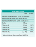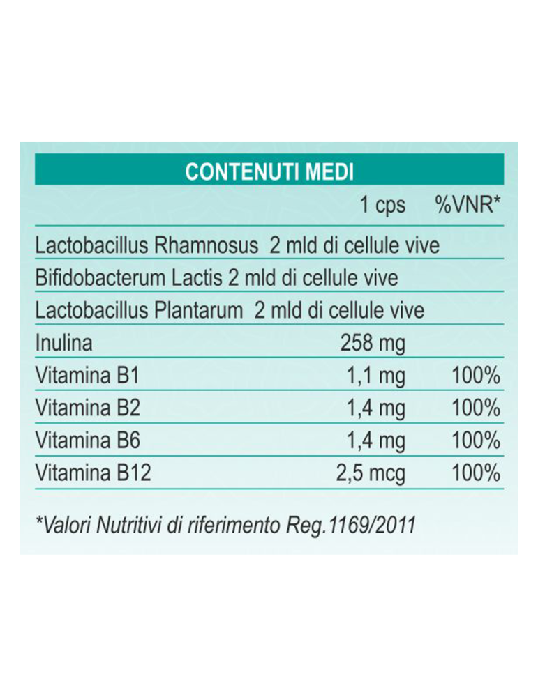 Inulina polvere, Gelatina alimentare, Agente di carica: Cellulosa microcristallina; Lactobacillus Rhamnosus DSM 25568, Bifidobacterum Lactis DSM 25566, Lactobacillus Plantarum DSM 24937, Agenti anti-agglomeranti: Biossido di silicio, Sali di magnesio degli acidi grassi; Vitamina B6 (Piridossina cloridrato), Vitamina B2 (Riboflavina), Vitamina B1 (Tiamina cloridrato), Vitamina B12 (Cianocobalamina).