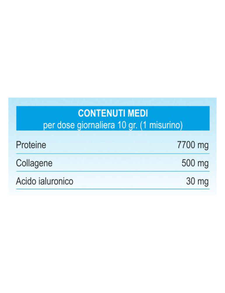 Proteine delattosate con lattasi, Maltodestrine, Collagene marino idrolizzato (derivato del pesce), Aroma Vaniglia, Sodio ialuronato, Agente antiagglomerante: Biossido di silicio; Edulcorante: Sucralosio. Allergene in grassetto.